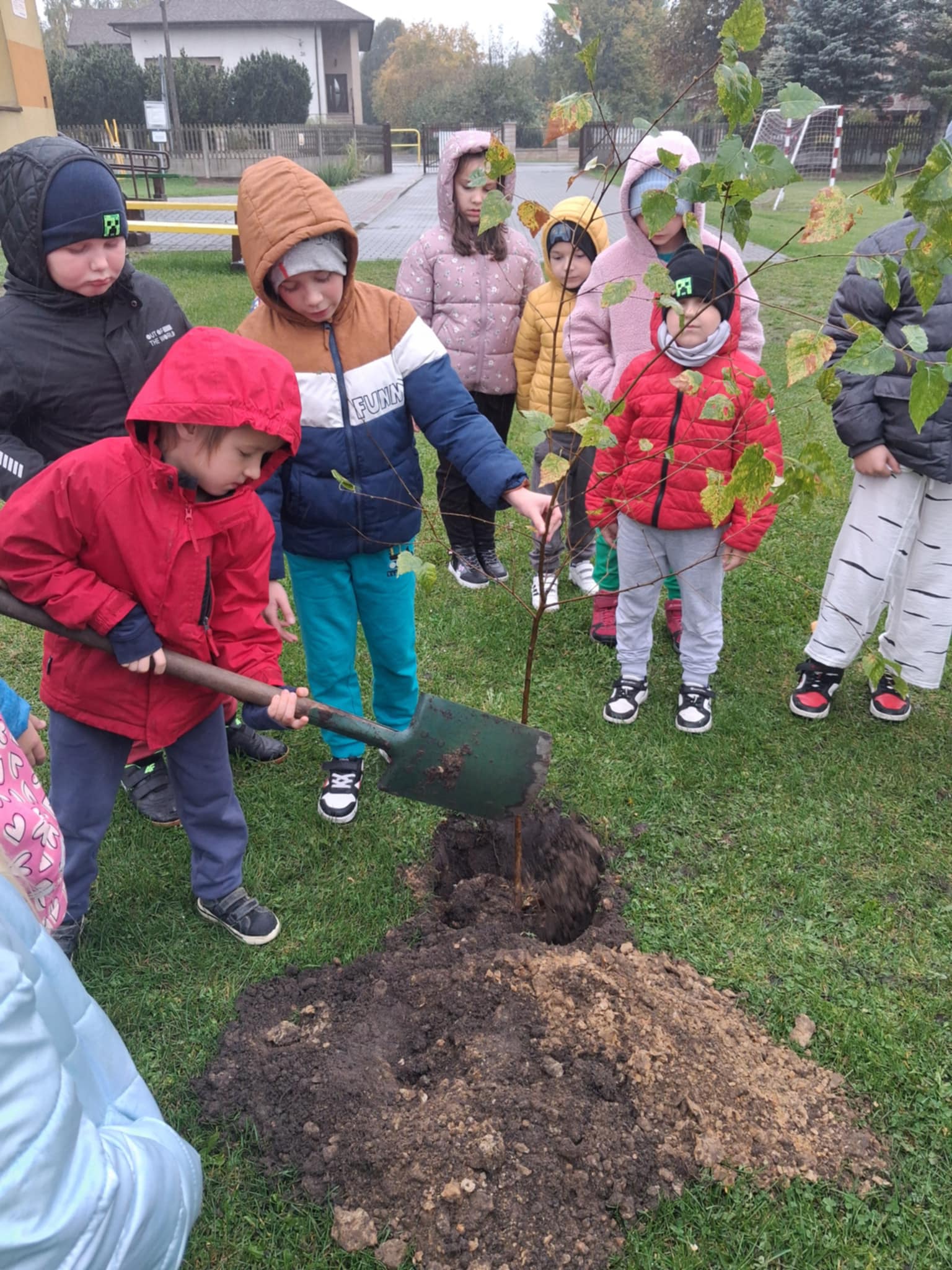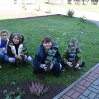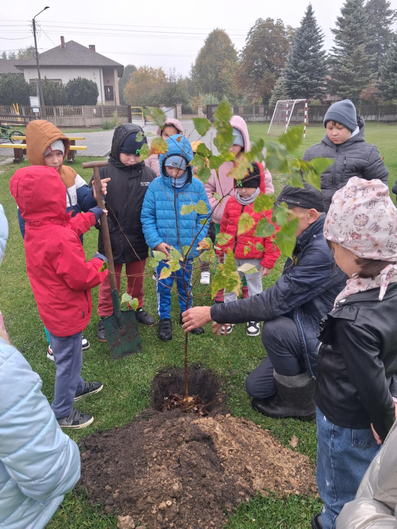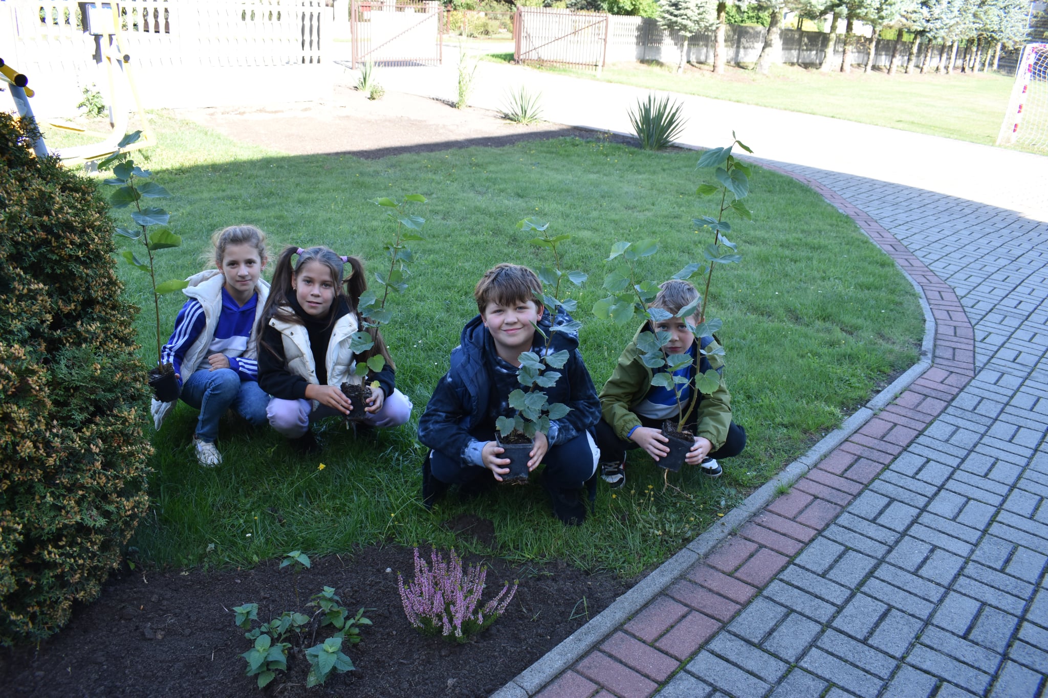 Na terenie szkoły posadziliśmy klony, które w przyszłości będą chroniły przed słońcem i deszczem.