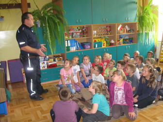 z rodzicami. Spotkanie to uatrakcyjniło zajęcia o tematyce komunikacyjnej, dzieci zapoznały się z rolą i zadaniami policji, wartością zawodu policjanta, jak i nabyły zaufania do tego zawodu. Uświadomiły sobie jak ważną sprawą jest zachowanie bezpieczeństwa i znajomość zasad ruchu drogowego.