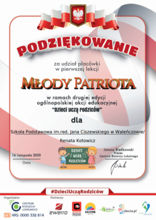 W tym roku ze względu na pandemię i przejście na naukę zdalną działania w ramach tej akcji przybrały inny charakter. W naszej szkole wśród uczniów klas IV-VIII został przeprowadzony konkurs na plakat pt. „Miejsca pamięci narodowej w najbliższej okolicy”. Za udział w tym wydarzeniu szkoła otrzymała pamiątkowy dyplom.
