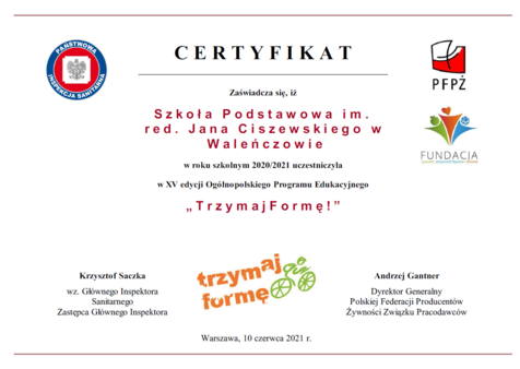 W roku szkolnym 2020/2021 nasza szkoła po raz kolejny przystąpiła do Ogólnopolskiego Programu Edukacyjnego „Trzymaj Formę”, który jest współorganizowany przez Główny Inspektorat Sanitarny oraz Polską Federację Producentów Żywności Związek Pracodawców w ramach realizacji strategii WHO dotyczącej diety, aktywności fizycznej i zdrowia.