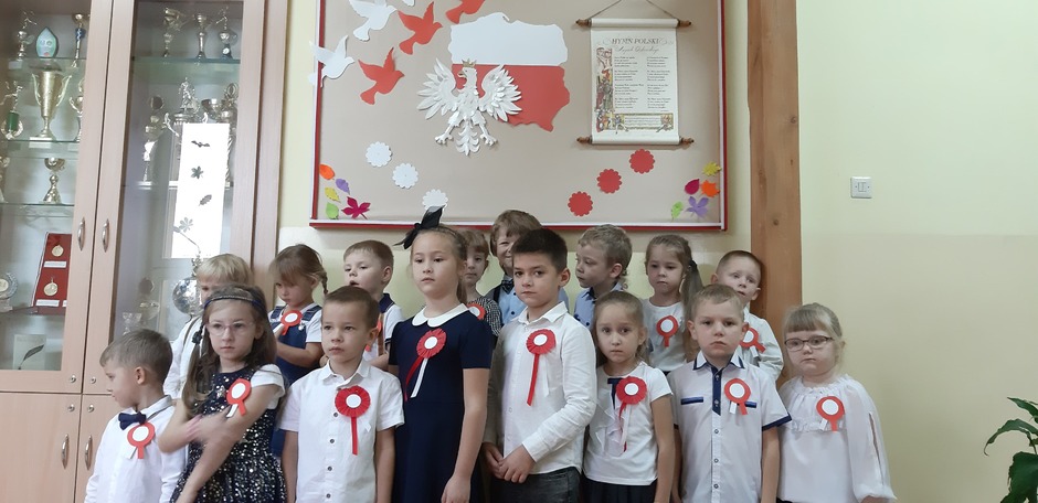 W tym roku nasza szkoła przystąpiła do kolejnej edycji akcji „Szkoła do hymnu” i odśpiewania „Mazurka Dąbrowskiego” w przeddzień Narodowego Święta Niepodległości 10 listopada, o godz. 11.11. Ze względu na ograniczenia spowodowane sytuacją epidemiczną hymn na żywo odśpiewały dzieci, które były tego dnia w szkole, czyli przedszkolaki. Pozostali uczniowie, którzy uczą się na odległość, połączyli się za pomocą komunikatorów i zaśpiewali hymn w formie online.