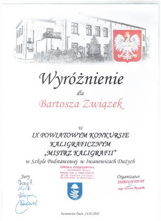 W kategorii klas II-III wyróżnienie otrzymał uczeń naszej szkoły Bartosz Związek. Bardzo się cieszymy, gratulujemy osiągnięć i życzymy kolejnych sukcesów.