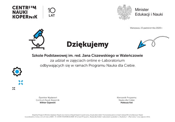 Wirtualna wizyta e-Laboratoriów odbyła się w ramach wspólnego programu Ministerstwa Nauki i Szkolnictwa Wyższego oraz Centrum Nauki Kopernik - Nauka dla Ciebie. Odbywała się w formie dialogu i interakcji uczestników z prowadzącymi zajęcia naukowcami.