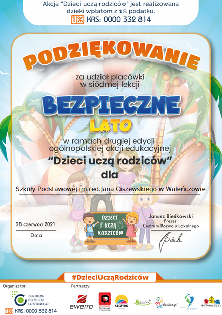 Dzieci Uczą Rodziców to druga edycja ogólnopolskiej akcji organizowanej przez Centrum Rozwoju Lokalnego we współpracy z innymi instytucjami edukacyjnymi. W akcji uczestniczą dzieci z klas II - III. Raz w miesiącu w klasach przeprowadzana jest lekcja w oparciu o materiały edukacyjne przygotowane przez organizatorów akcji. Tematyka zajęć związana jest z edukacją społeczną, patriotyczną - historyczną, przyrodniczą.